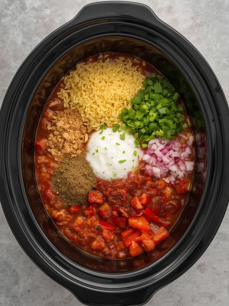Add the diced bell peppers, beans, diced tomatoes, tomato sauce, tomato paste, chicken broth, and all seasonings to the slow cooker. Stir well to combine everything.